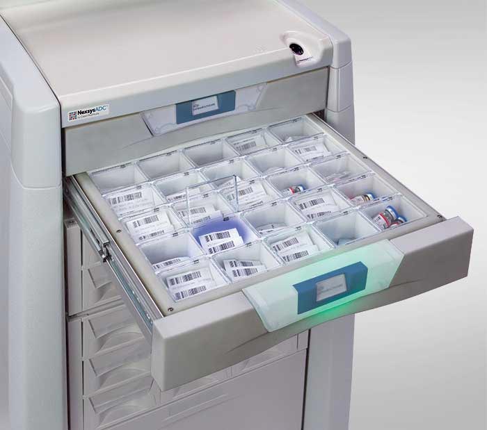 The cabinet uses “pick-to-light” technology and barcode scanning to guide nurses to the correct medication and dosage, virtually eliminating the risk of pulling the wrong vial or tablet.